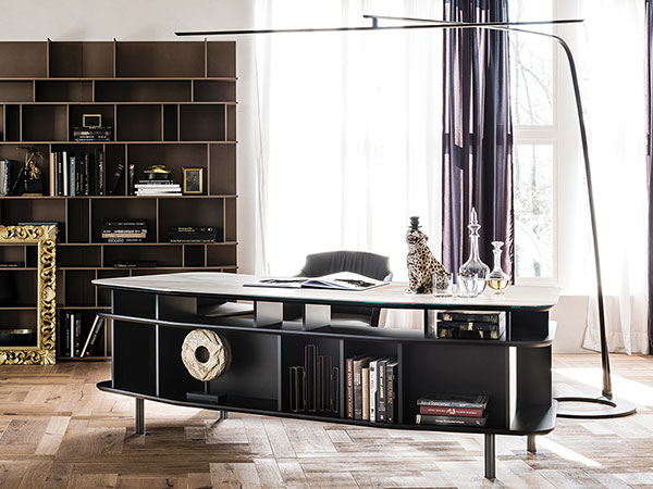Desk in titanium (GF11), graphite (GF69) or black (GF73) lacquered embossed MDF. Top in ceramic Marmi Calacatta (KM01), Alabastro (KM02), Ardesia (KM04), matt Golden Calacatta (KM05), glossy Golden Calacatta (KM06), matt Portoro (KM07), glossy Portoro (KM08), glossy Sahara Noir (KM09), Emperador (KM10), Makalu (KM11), Breccia (KM12) or Arenal (KM13).