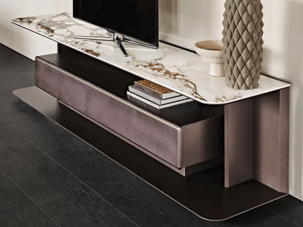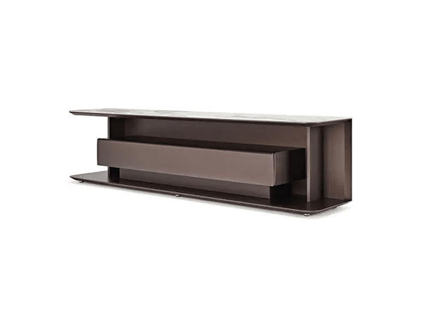 The Ward TV stand puts almost everything on display, promoting conviviality by expanding a room and allowing for even more storage, decorations, and space for a television than some iterations of this furnishing. The robust lacquered wood frame opens up to show the skeleton, which includes a drawer behind a flap door. Choose what you want to show off and what you wish to hide; ample ornamentation and necessary electronic devices can litter the product between the sides, central compartment (inside and on top), and luxurious ceramic top. A TV can be installed easily with a cable guide for added convenience.
